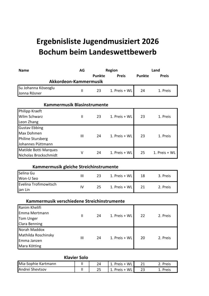 Ergebnisliste Jugendmusiziert 2026 Bochum beim Landeswettbewerb: