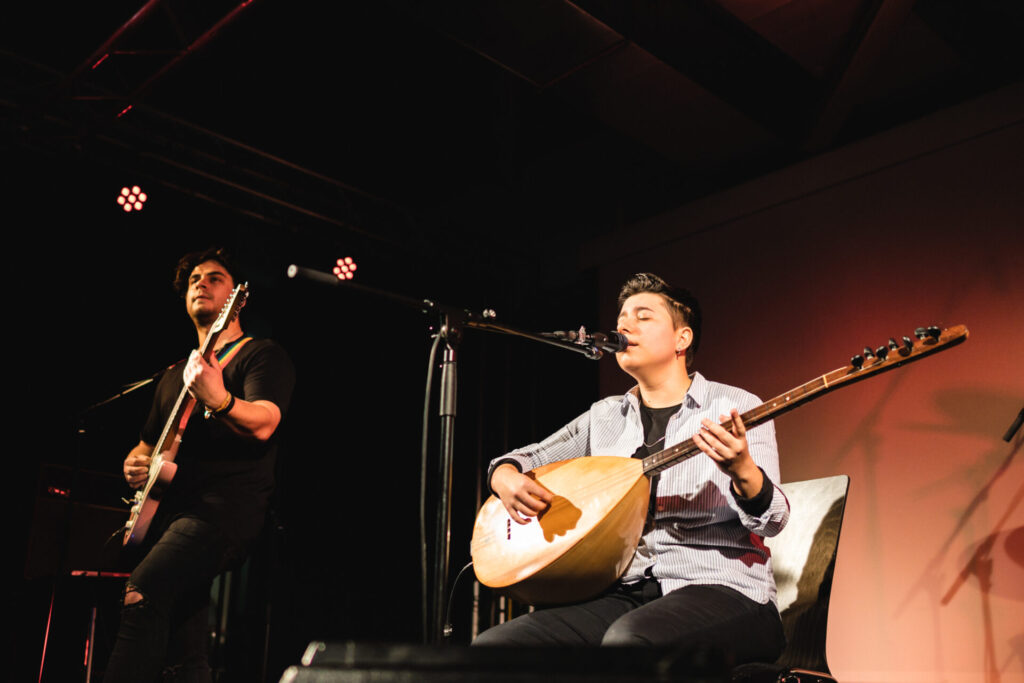 Im Anschluss hast du die Möglichkeit, in den zeitgleich stattfindenden Workshops mit Joannie Labelle (Perkussion) und Nihat Iman (Bağlama) selbst aktiv zu werden. Für Interessierte, die nicht an den Workshops teilnehmen, besteht parallel die Möglichkeit zum persönlichen Austausch mit dem Studiengangsleiter.